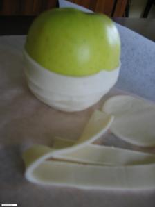 Cut a circle (glass size) of puff pastry for the bottom of the apple, then cut 1cm strips of puff pastry.