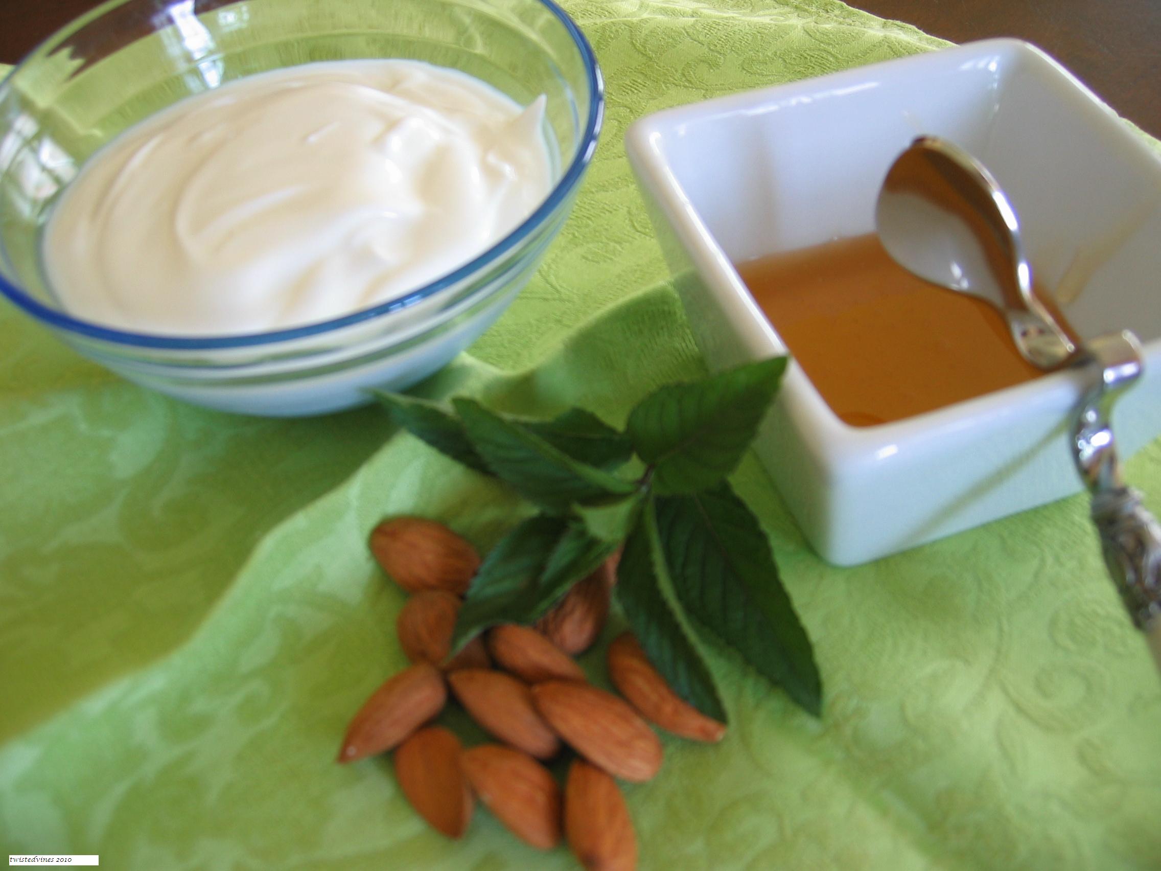 Combine yogurt and honey, mix well…cut into small pieces the almonds, add a couple of mint leaves, and wow a great substitute for ice-cream of whipped cream…