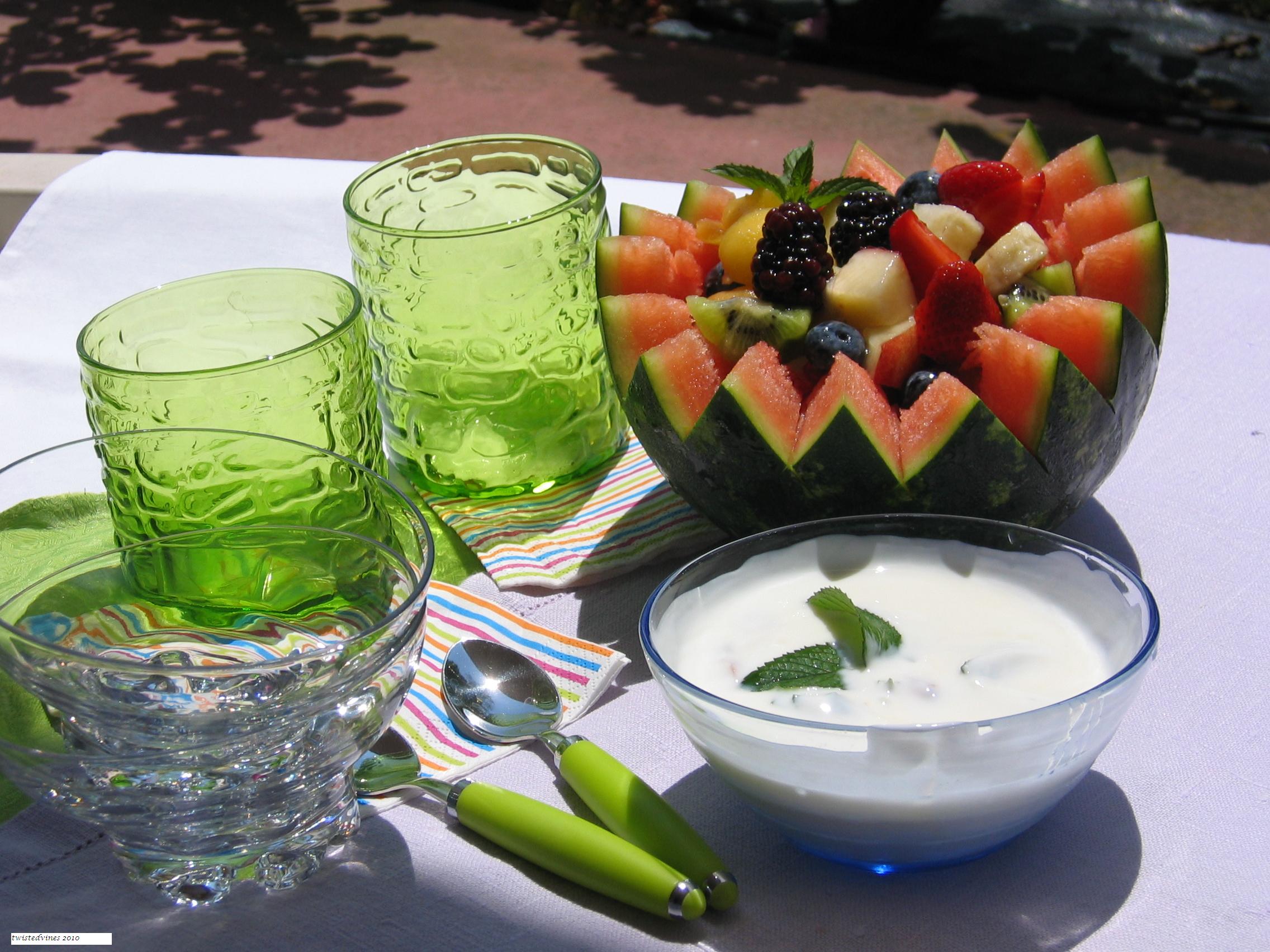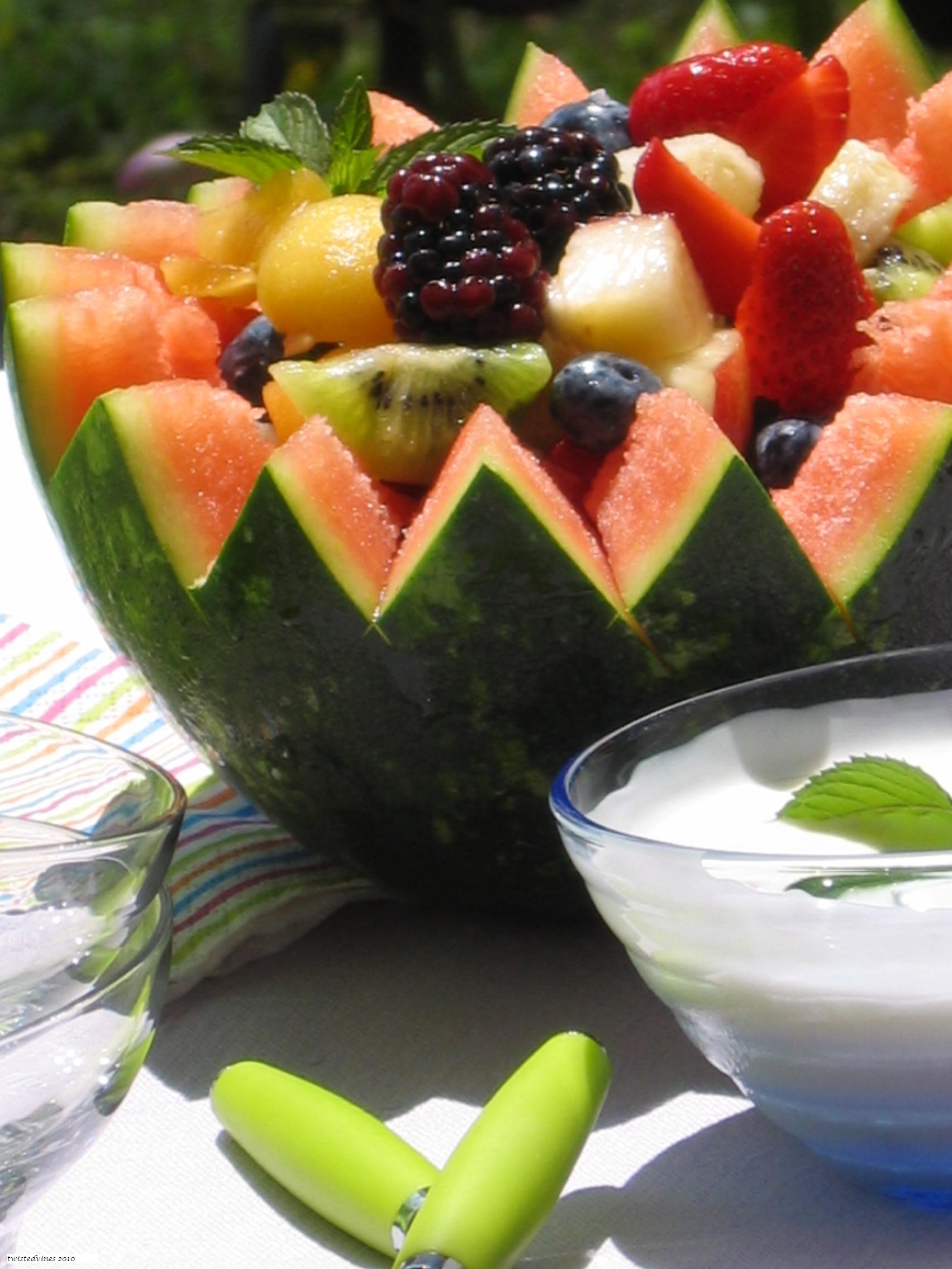 A great time to break for lunch with a fresh fruit salad and yogurt cream.The fruit salad was made with seasonal fruits and then presented in a baby watermelon. That’s easy! …and so is the yogurt cream.
