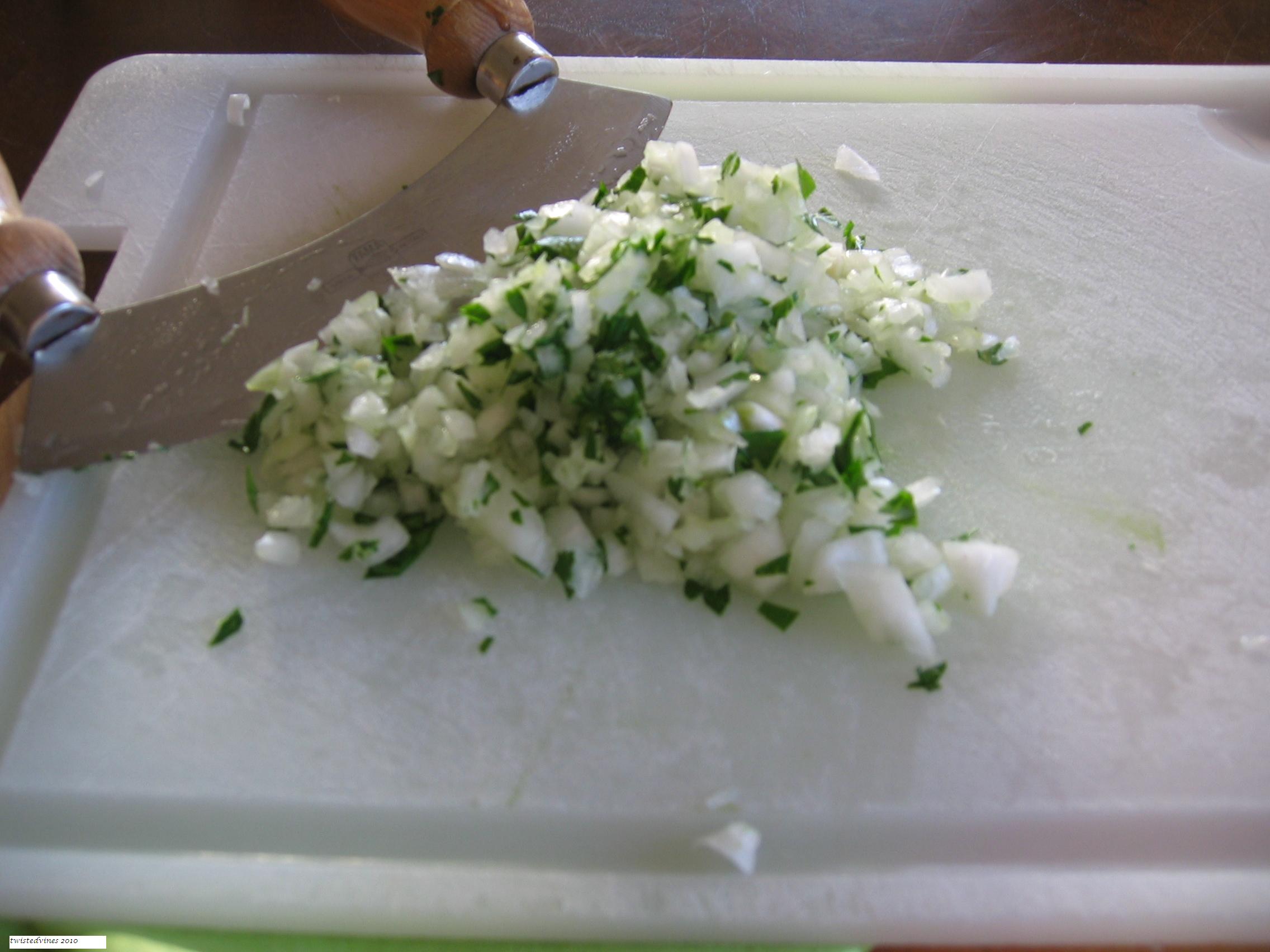Chop very finely the white onion and parsley with the mezzaluna. Place 30 grams of butter and a dash of olive oil in a heavy base pan, by adding the olive oil the butter won’t burn.