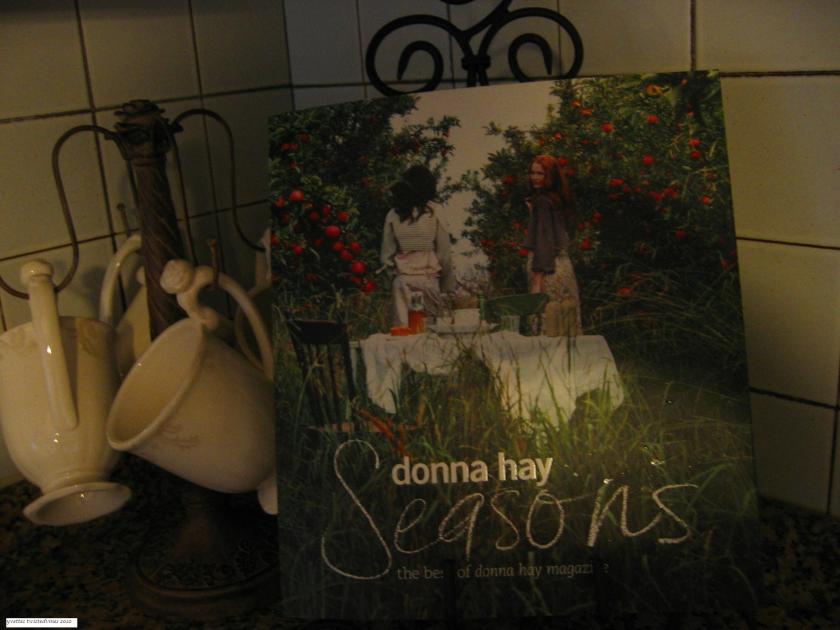 I always have a cookbook out for inspirations, my favourite at the moment is Seasons by Donna Hay. It’s a beautiful cookbook of recipes, the best from her magazines…complete with beautiful photographs of the changing seasons…a real “escape” cookbook. I bought this on my last trip home, actually leaving behind clothes to fit this in the suitcase, I’ve yet to try a recipe from it , but when I do I’ll let you know.