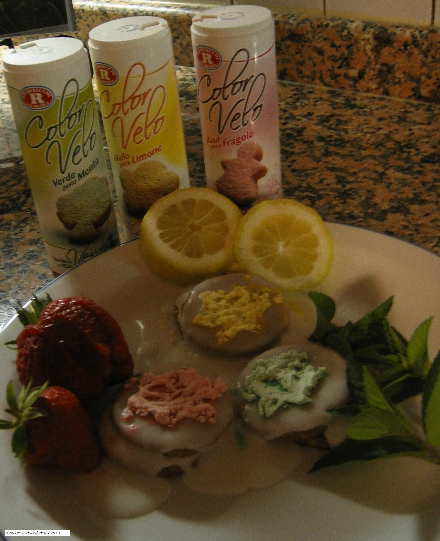 I’ve only just discovered this product on the market. It’s coloured flavoured icing sugar…great for a bit of variety in the decorating department. There’s pink coloured strawberry flavour, yellow coloured lemon flavour and green coloured mint flavour. An eye catcher and great flavours for cupcakes, cakes and biscuits.