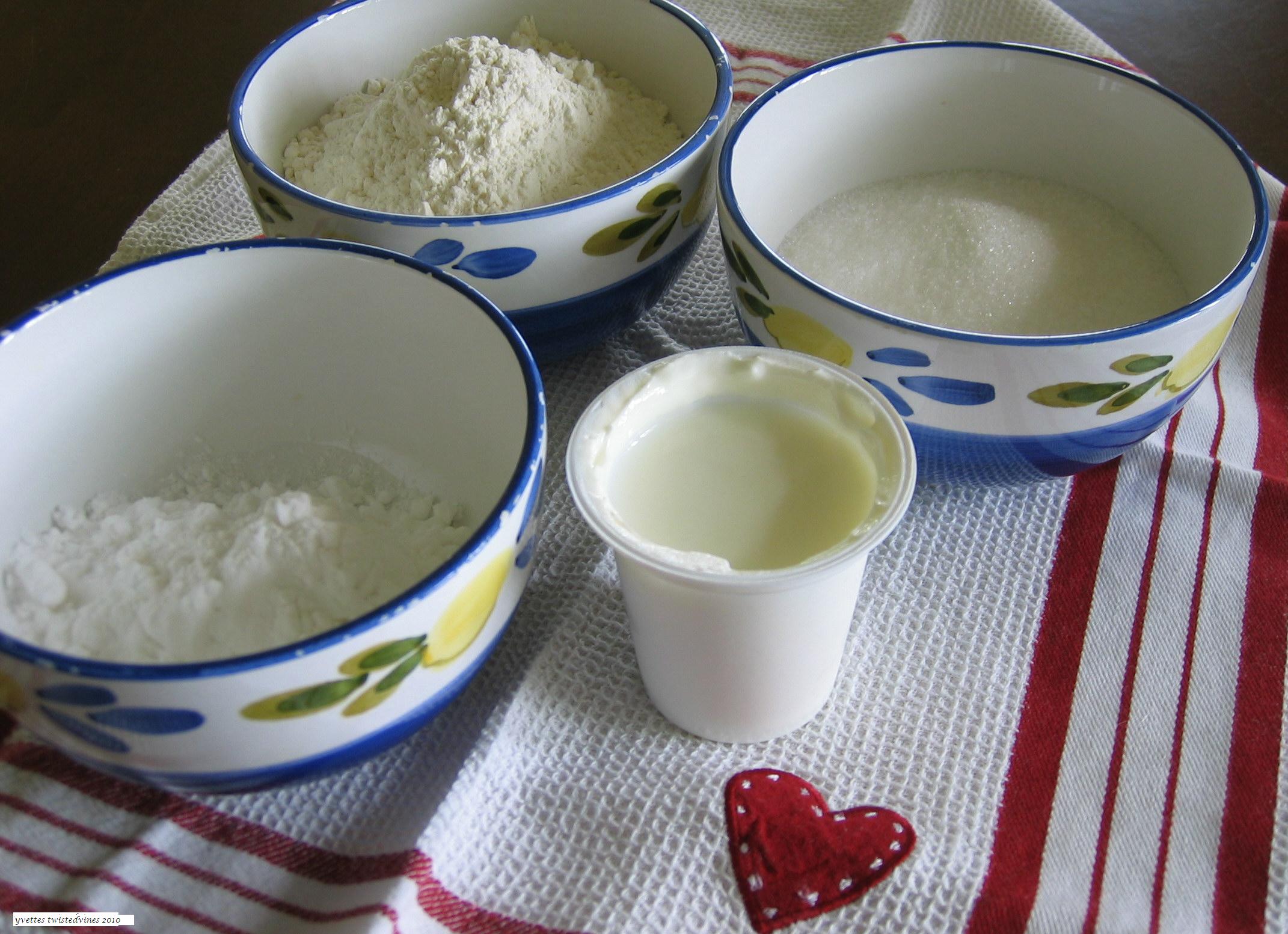 Place yoghurt in mixing bowl. Sift the two flours adding to yoghurt, add sugar, sunflower oil, vanilla essence, lemon essence. Divide eggs, add egg yolks to this yoghurt mixture and mix well. Whisk egg whites until forming stiff peaks.Fold through yogurt mixture.