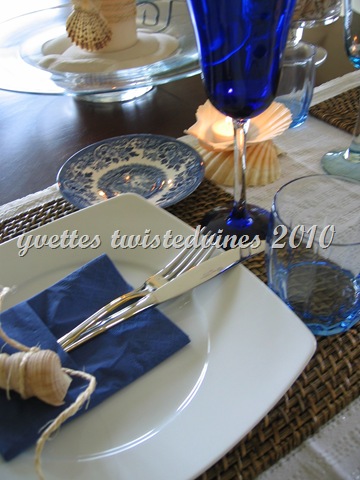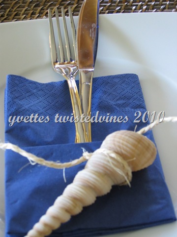 Using blue napkins…now here’s a personal choice..yes I love white linen “real napkins” but with the unlimited use of paper napkins with their colors and prints you can find today…your dinner party napkin ideas are infinite. For decoration on the napkin I used everyday kitchen twine and twisted it around a shell as shown in the photo below.