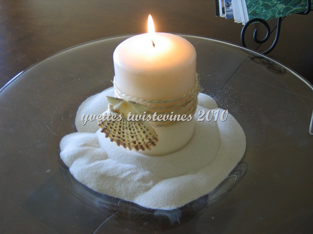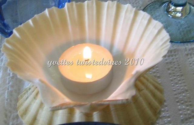 I had scallop shells saved away,and these are a great ocean theme accessory, place one facedown, and rest the other on top, place a small tea lamp candle inside. These are also great accessories for outside partying, lighting a pathway or around the table at ground level.