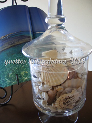 I added a glass vase with mixed sized shells…