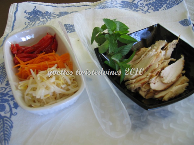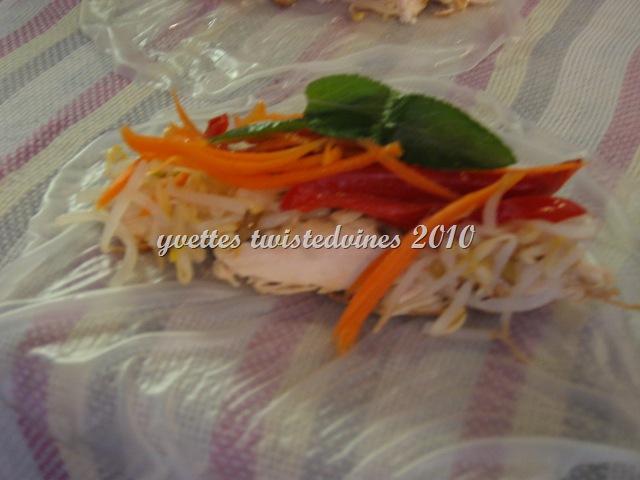 Grill chicken fillets. Allow to cool and slice long strips. Prepare rice paper. Fill a shallow pan with water and heat for 2 or 3 minutes,turn off heat. Place a rice paper wrapper into the water until it’s soft and pliable ( about 15 – 20 seconds).Remove from pan and place under cold running water, lay flat on a damp tea towel. Place the filling of your choice or from my recipe, in the middle of the rice paper wrapper…grilled chicken strips,carrot,red capsicum,bean sprouts and fresh mint leaves.