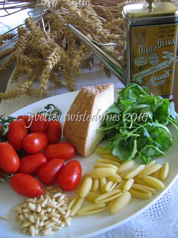 Add pasta, and mix well.Add olive oil,salt and pepper freshly grounded.Add additionional whole pine nuts, and pitted kalamata olive.![]()