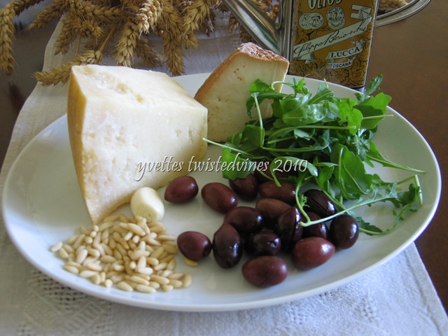 In mixer add rocket,smoked ricotta,parmesan,garlic and olives.