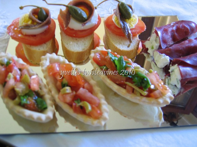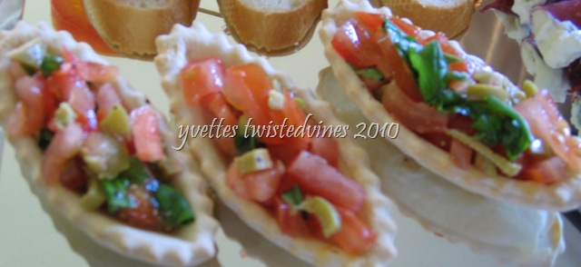 …pastry boats filled with tomato and green olives,with fresh basil…
