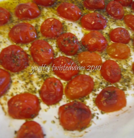Heat the oven to 180° C. Cut the cherry tomatoes in half placing seeded side down on oven proof paper on a baking tray. In a bowl mix the olive oil, oregano, grated garlic , salt and pepper. Pour over cherry tomatoes and slow cook for about 80 minutes. ![]()