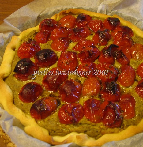 Pour the creamy eggplant mix into pastry shell, cook in oven for about 25 minutes. The eggplant mixture will firm.Decorate with prepared cherry tomatoes.