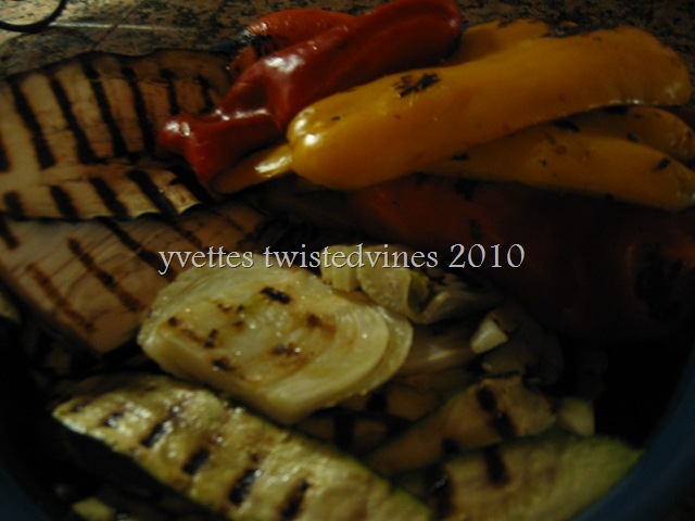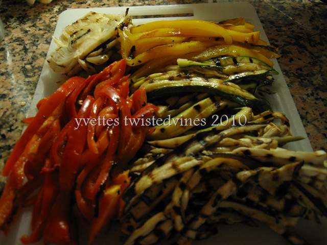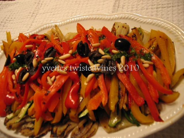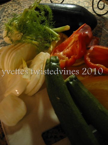 Nothing hard about that, this dish is all in the presentation…after you’ve grilled the vegetables slice into thin strips, leaving the fennel in slices …![]()