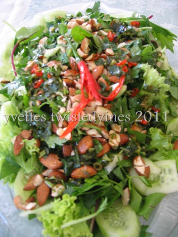 Prepare salad greens and cucumber on serving plate, sprinkled chopped almonds and chilli on top. Prepare sauce and pour over salad.