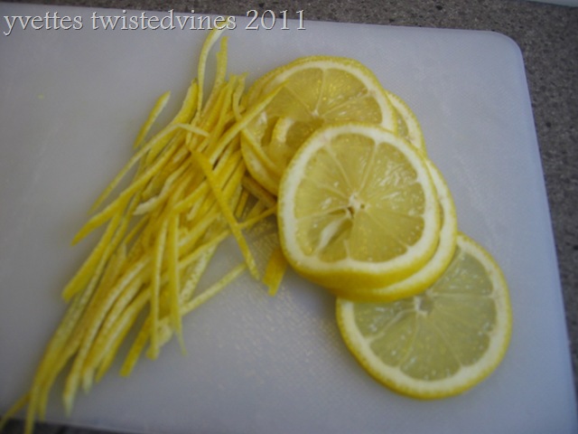 Put the sugar in a pan with the water and stir over low heat until sugar has dissolved. Cut the rind of 1 lemon into thin strips and circles as thin as you can.