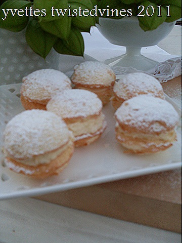 This is an incredibly easy recipe,which can be whipped up in minutes, baked in 3 minutes, and then filled in no time, for a very impressive dessert. These are called Angel Powder Puffs.