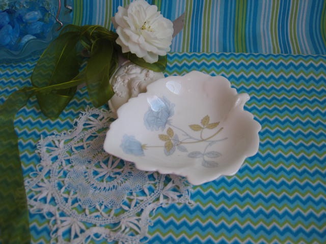 This Wedgewood leaf plate is called ‘Ice Rose’, an intricate rose design with a single gold stem and leaves.