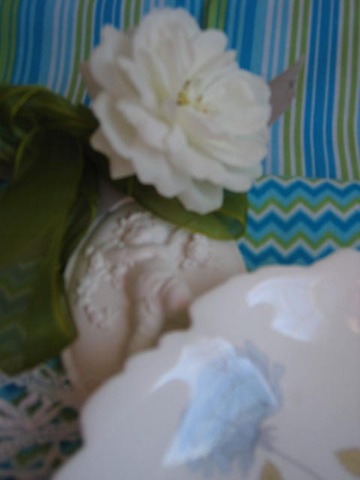 This just so refreshingly lovely.., I love each and every detail and especially the artfully arranged vignettes with the white flower, green ribbon and blue and white tea mug on the fabrics.., Fabulous!
