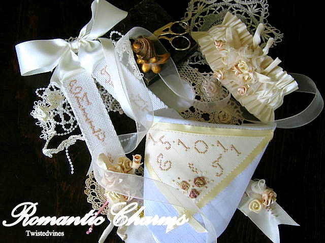 Threads, silks, ribbons, cross stitch, roses, pearls, dates and promises.This week has seen my sister working her fingers, making some romantic ribbons for a wedding celebration.