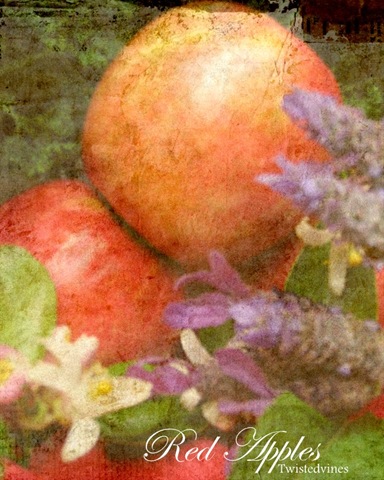 I captured my photo within the gardens hide away corner of mountains of parsley, sage and mint, lavender and lemon tree blossom and threw in a vivid touch of contrasting red. Pink Lady apples.