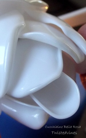 What would you say if I told you, these faux ceramic roses, were made out of a $1.00 packet of plastic teaspoons. No, you say. Yes, they are…made by my sister, in a couple of hours. Each spoon is melted under a flickering candle flame.
